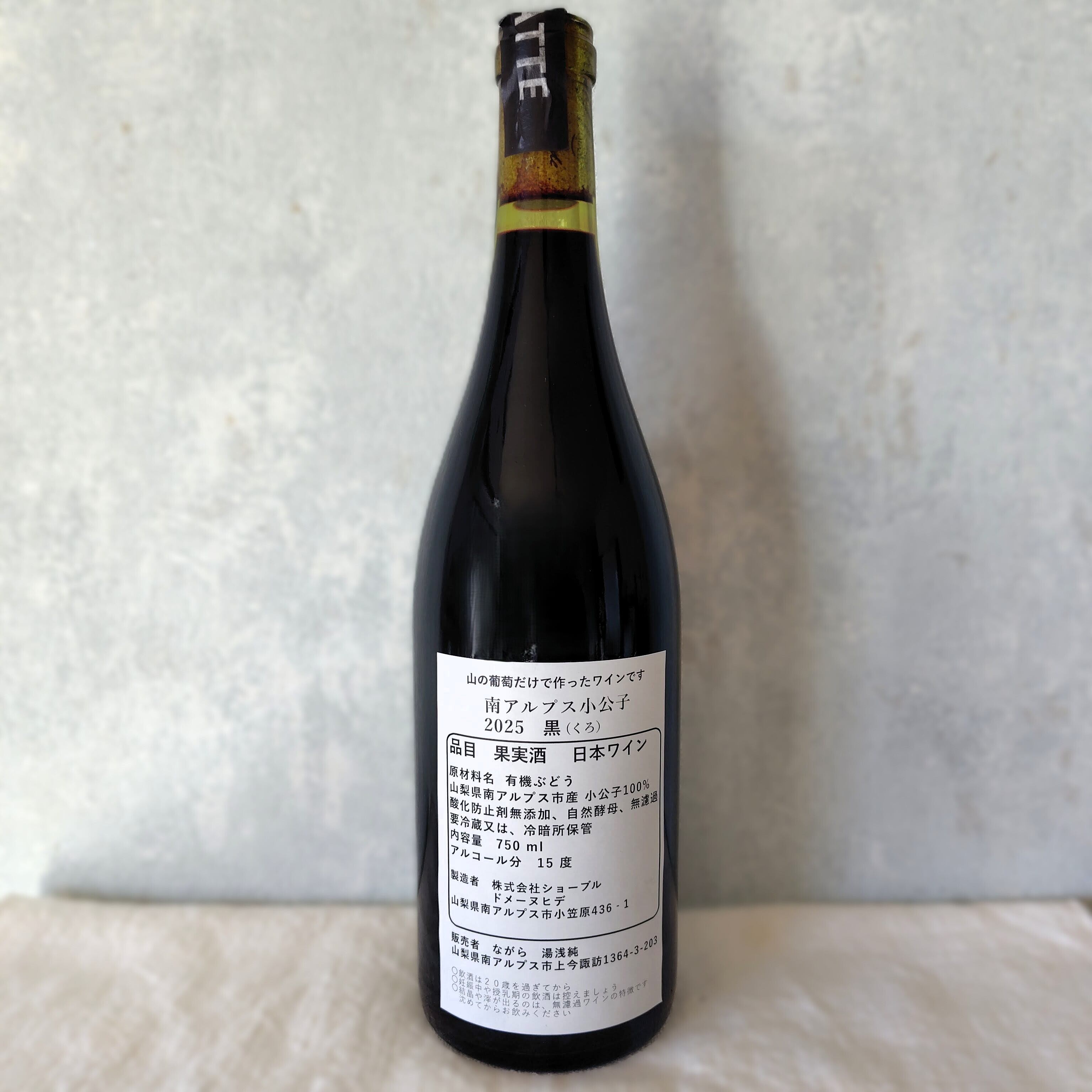 山梨県南アルプス市で、南アルプス山脈、富士山、八ヶ岳に囲まれて育った自然栽培・有機認証の葡萄、品種名「小公子」を赤ワインにしました。