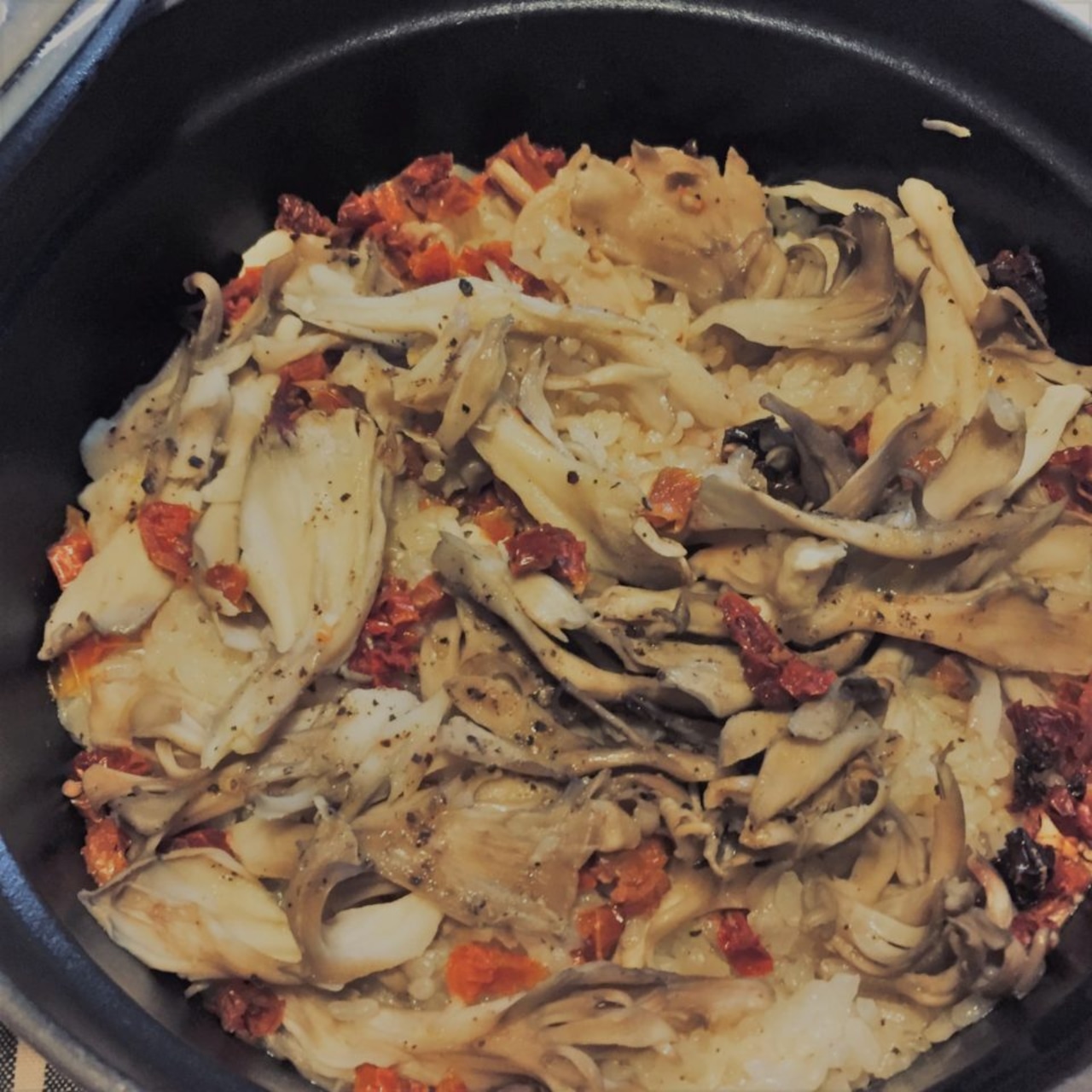 2.キッチンバサミで刻んだドライトマトときのこ類を上に載せる。